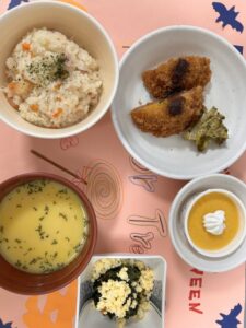 10月の行事食 10月の行事食 2025年11月4日未分類kunpu-en 10月30日、翌日はハロウィンということで10月の行事食はかぼちゃのお化け(ジャックランタン)にちなんでかぼちゃのクリームハムカツ、パンプキンスープ、かぼちゃプリンとかぼちゃづくしの献立となりました。どの献立も美味しく、みなさんペロリと完食されていました。 本日のメニュー ・えびピラフ ・かぼちゃクリームハムカツ ・ミモザサラダ ・パンプキンスープ ・かぼちゃプリン