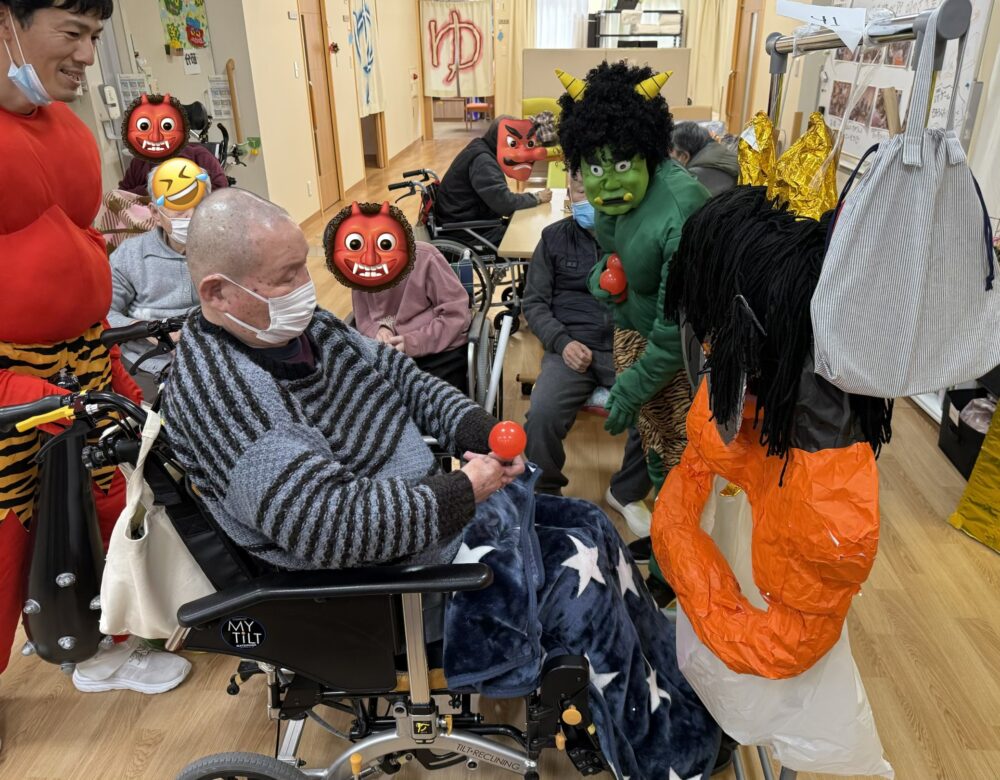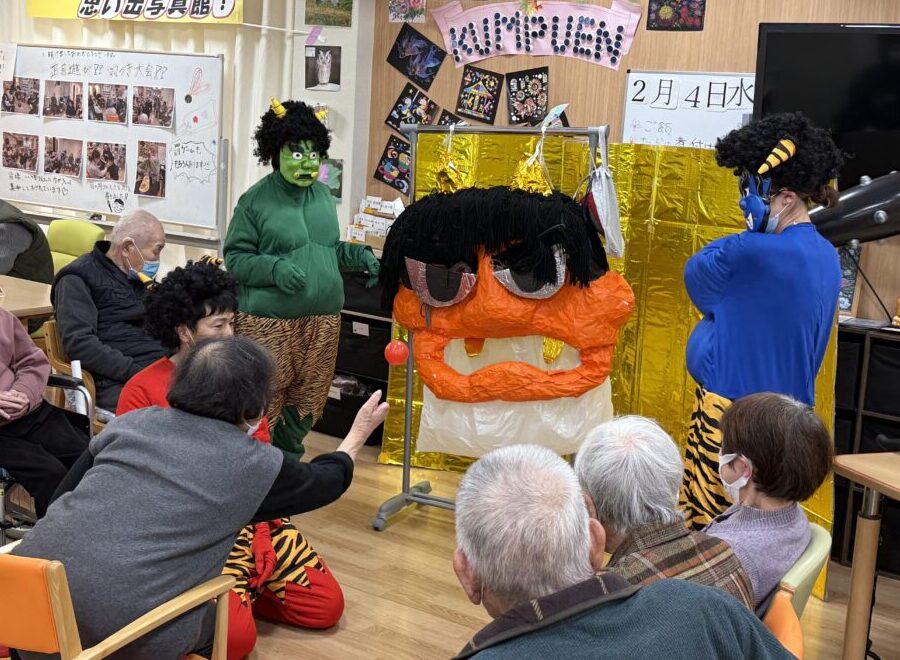 暖かい日が出てきて春が近づいてくるのを感じます。少し遅めですが2月26日(木)に節分イベントを行いました。「鬼は外~福は内」薫楓苑では豆まきの準備体操を行った後、赤鬼と青鬼と緑鬼が登場し、 利用者様たちに紙の豆を配った後で豆まきを行いました。皆様喜んでどんどんと鬼に向かって豆をまき、鬼もタジタジになっていました。豆まきの後は獅子舞の踊りがありました。スタッフが獅子を演じ、利用者様の邪気を祓い、無