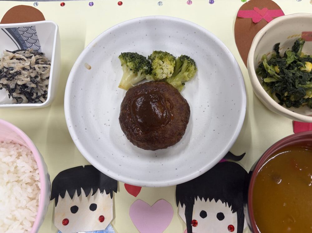 2月の行事食のメニューはバレンタインが近いということもあって、チーズ入りハンバーグにブロッコリーを添え、ハートに似せた形を作りました。他の献立も美味しく、皆様ペロリと召し上がられていました。