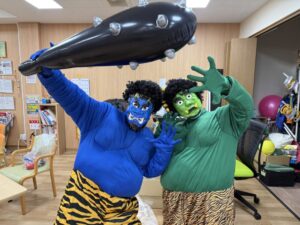 桃太郎に登場する、桃太郎・雉・猿・犬の面をつけて鬼に見立てた棒を倒していくゲームに挑戦していただきました☆